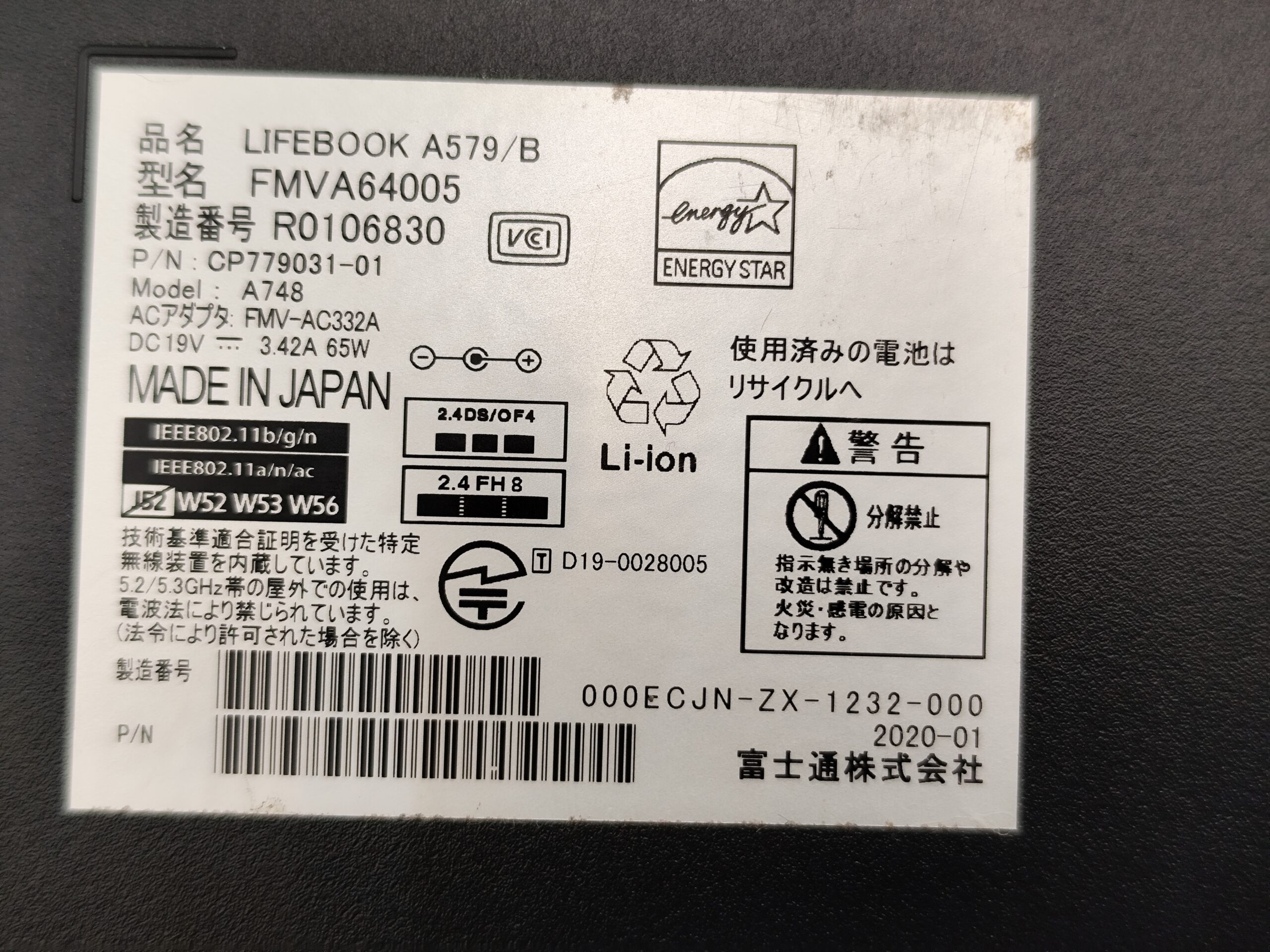 型番:LIFEBOOK A579/B / FMVA64005